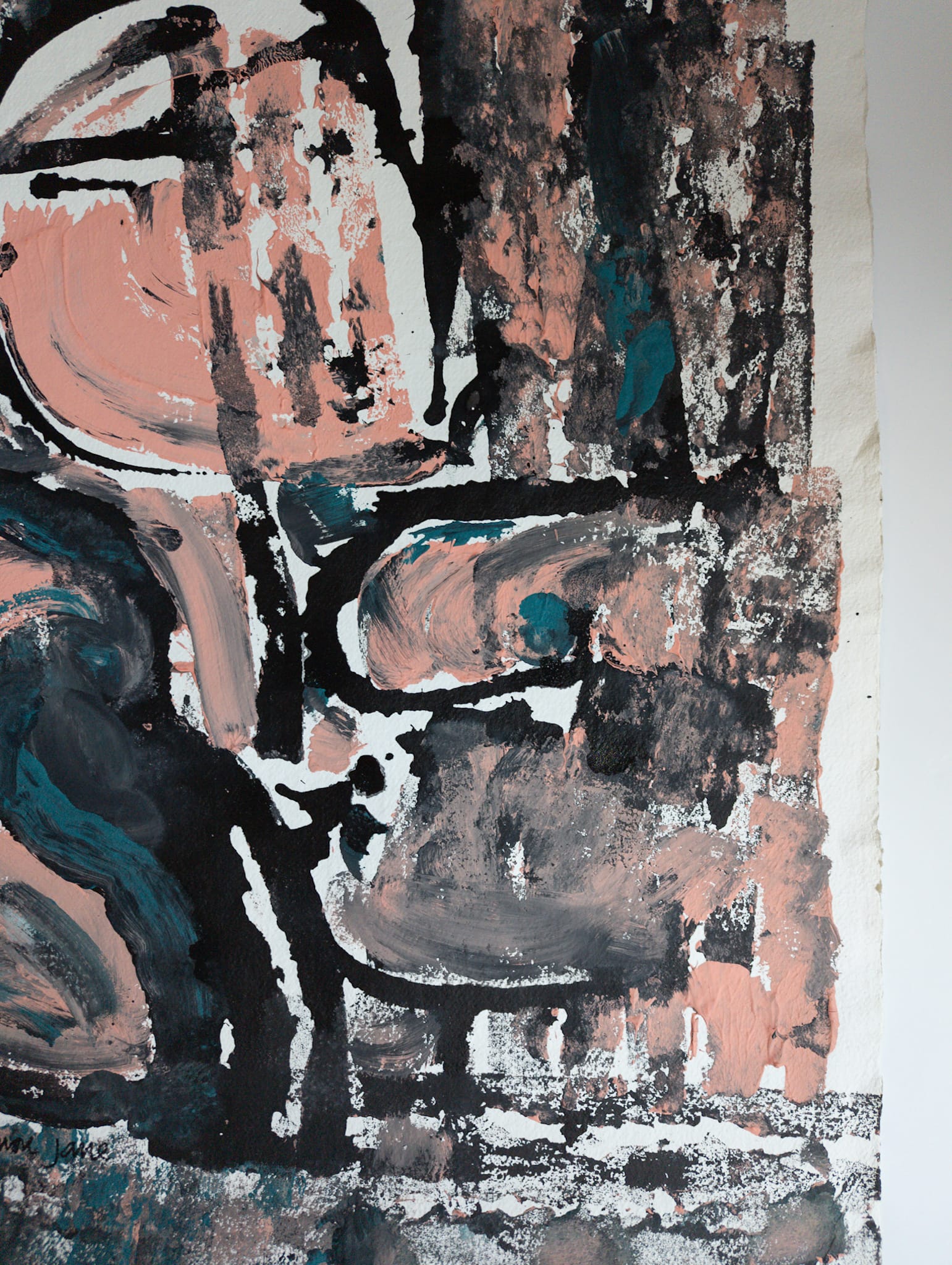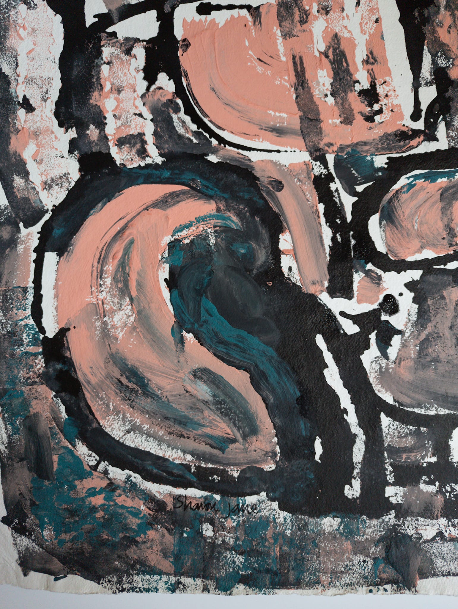 - Acrylics and gouache on a heavy weight khadi paper, corals, teal + blacks.